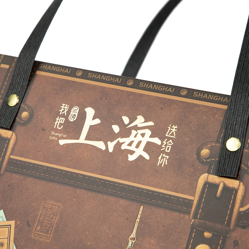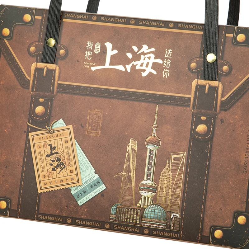 กล่องกระดาษของขวัญส่งไปรษณีย์เลียนแบบรูปลักษณ์ของกระเป๋าเดินทางสมัยเก่า ใช้สีพื้นสีน้ำตาลแก่ โดดเด่นด้วยหมุดหนังเทียมและหัวเข็มขัด พร้อมด้วยลวดลายนูนสีทองของสถานที่สำคัญของเมือง เช่น Oriental Pearl Tower และถนนสายเก่าของเซี่ยงไฮ้ เมื่อมองผ่านๆ มันชวนให้นึกถึงความทรงจำในอดีตของเซี่ยงไฮ้ในอดีต ทำให้โดดเด่นท่ามกลางกล่องของขวัญทั่วๆ ไป ไม่ว่าจะให้เป็นของขวัญหรือตั้งโชว์ก็มีจุดความจำที่แข็งแกร่ง